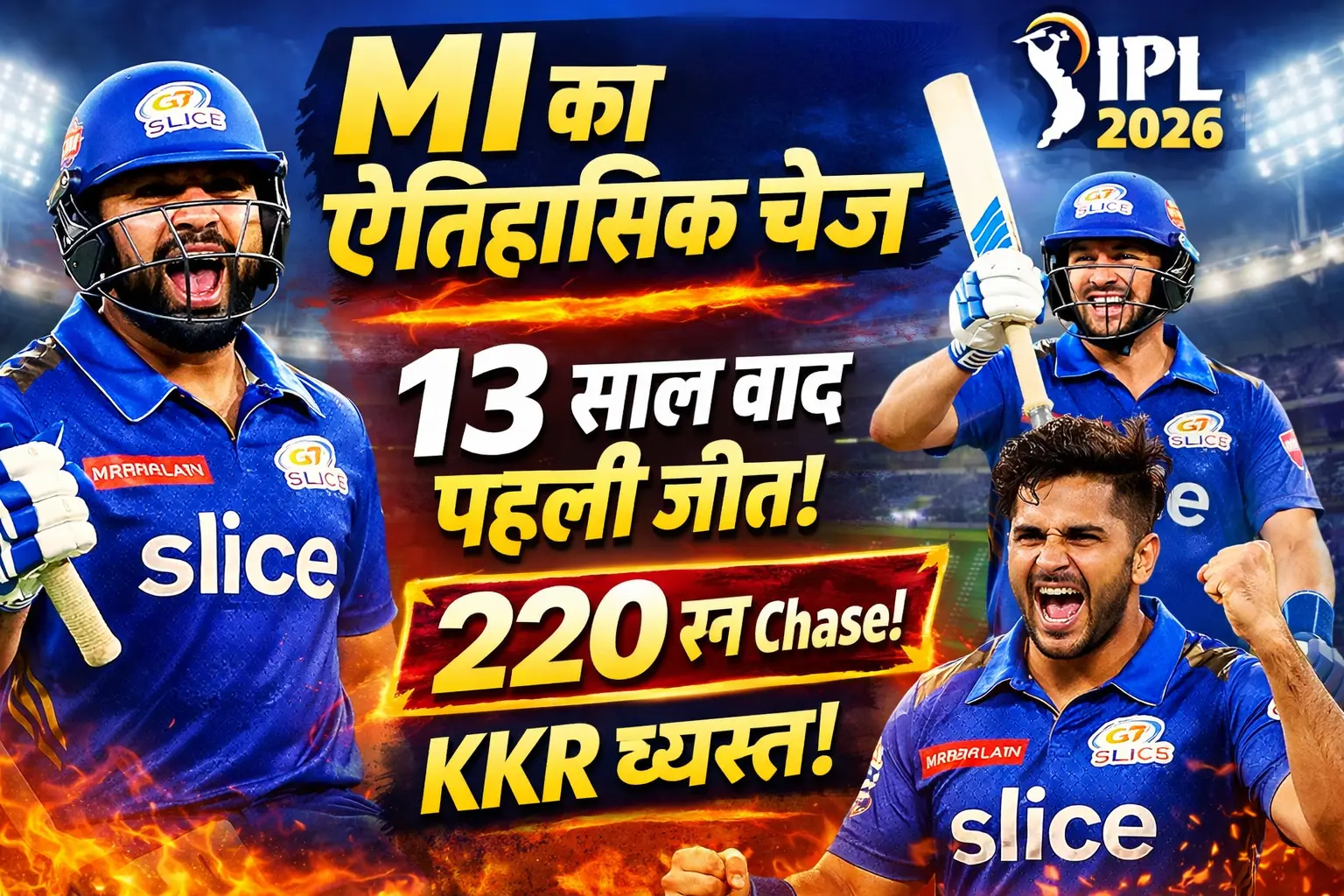 आईपीएल 2026 के मुकाबले में मुंबई इंडियंस (MI) ने कोलकाता नाइट राइडर्स (KKR) को 6 विकेट से हराकर इतिहास रच दिया। 220 रन का विशाल लक्ष्य हासिल करना मुंबई के आईपीएल इतिहास का सबसे बड़ा सफल रन चेज साबित हुआ। टीम ने 19.1 ओवर में 224/4 बनाकर 5 गेंद बाकी रहते मैच अपने नाम कर लिया।